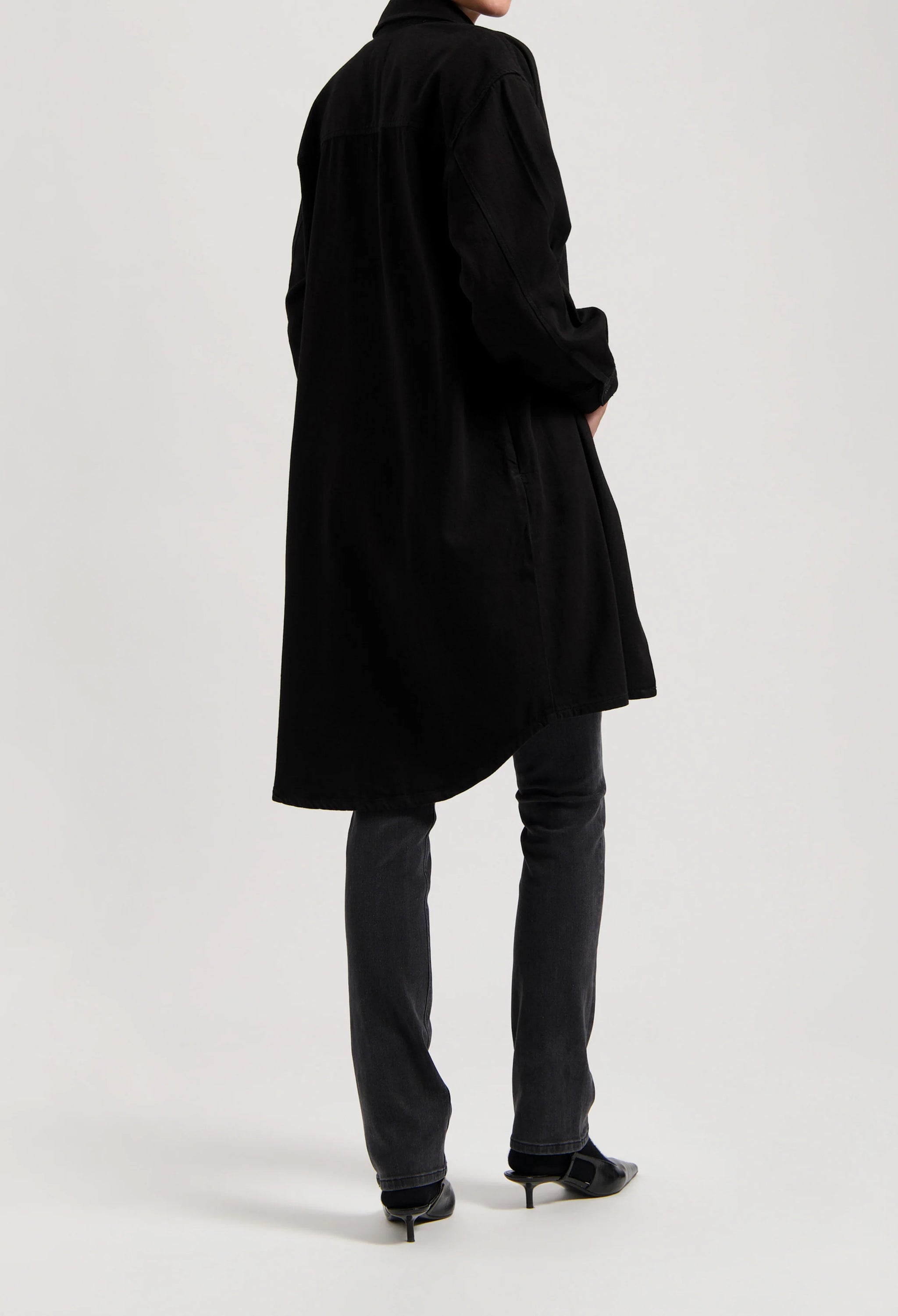 Kjolen har en rummelig A-linje pasform med en afrundet hals og 3/4 ærmer, som giver et afslappet udtryk. Den midi-længde skaber balance i silhuetten, mens den Blackdip sorte denimvask ligger som en rolig, dyb nuance, der fungerer som et neutralt udgangspunkt i mange outfits. Klassiske denimdetaljer er holdt tilbage til fordel for et minimalistisk og tidløst udtryk.